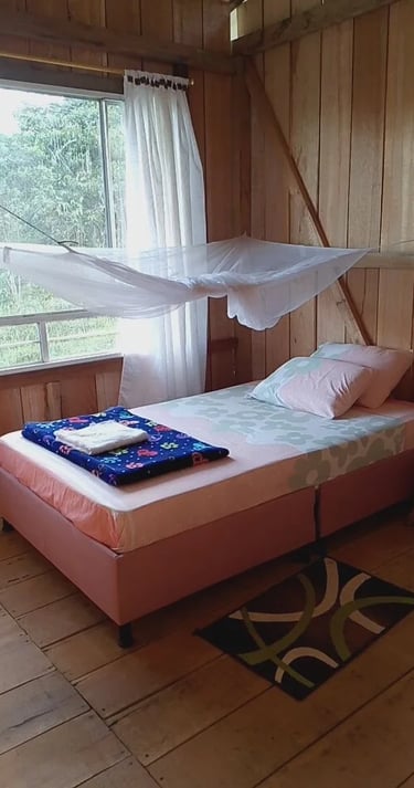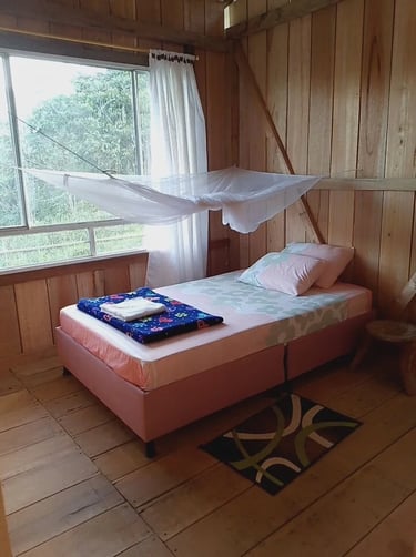 Stay in simple yet comfortable traditional Kamëntsá wooden cabin, on a shared basis with communal bathrooms, fostering a sense of community and connection among participants.